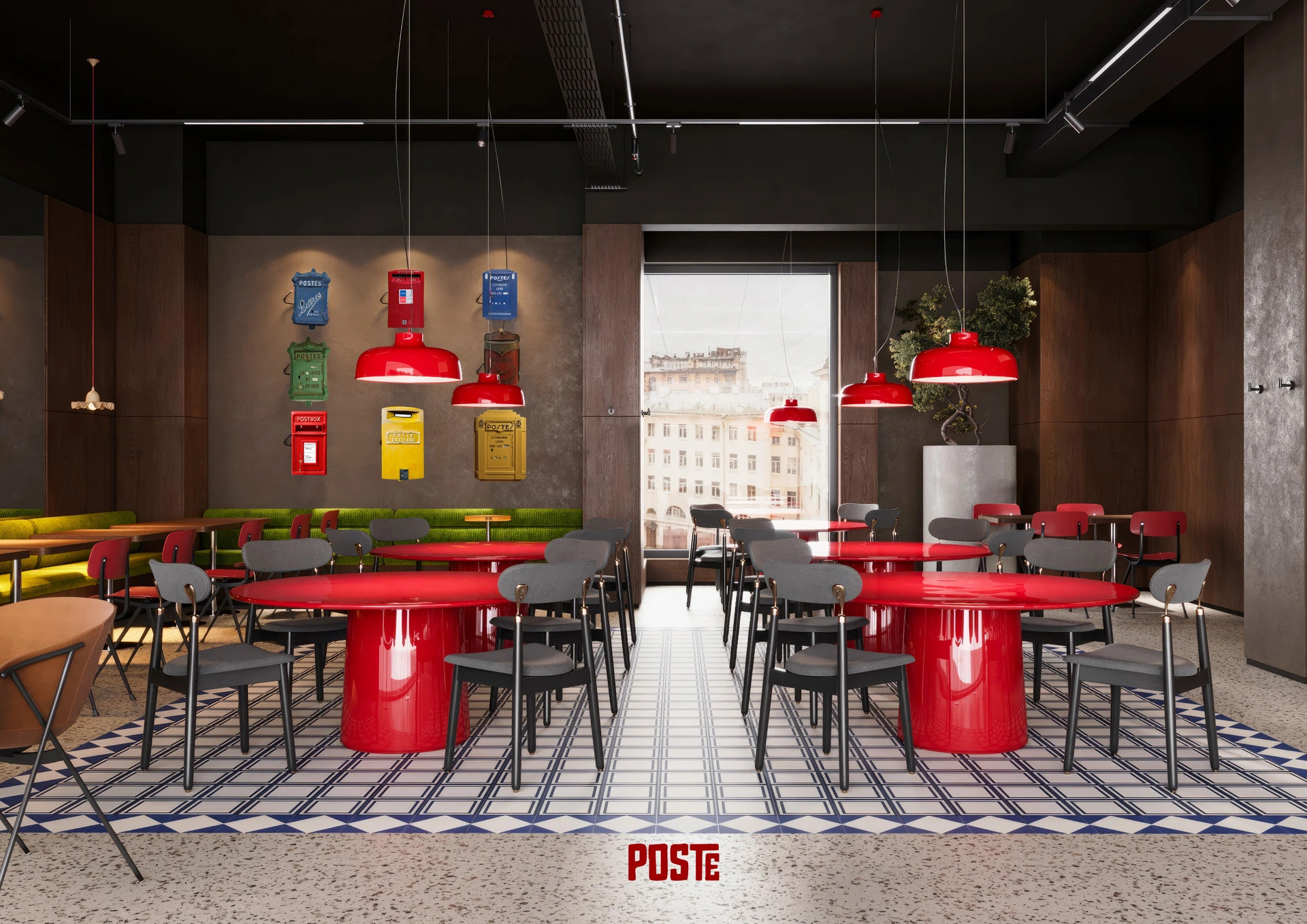 “Kirson Design Group” izstrādātā dizaina un telpiskā koncepcija atspoguļo uzņēmuma līdzdibinātājas un vadītājas Evijas Ķirsones-Slavinskas radīto projekta vizuālo identitāti, piešķirot tam unikālu zīmola raksturu – līdzsvaru starp pilsētas dinamiku un estētisku mieru. “Projekts “POSTe” turpina t/c “Origo” koncepciju, attīstot stāstu par ceļojumu laikā un telpā. Interjera dizainā integrēti 80. gadu elementi un atsauces uz dažādu pasaules valstu kultūrām caur pasta tēmu, akcentējot garšu ceļojumu un satikšanās prieku. “POSTe” ir veidots kā mūsdienīga, atvērta vide, kurā vēsturiskā arhitektūra harmoniski savijas ar Rīgas centra enerģiju un starptautisku noskaņu, radot līdzsvaru starp pilsētas centra dzīvīgumu un estētisku nosvērtību,” uzsver Evija Ķirsone-Slavinska.